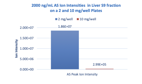 간 S9 fraction에서 2000 ng/mL Inclisiran AS 추출 시, 2 mg/well plate의 이온 강도( 1.86E+07)가 10 mg/well plate( 2.99E+05) 대비 약 62배 증가. Micro-elution 포맷의 분석물 농축 효과로 MS 감도 극대화.