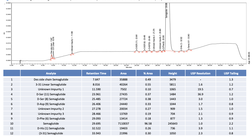 Assay 조건에서 8종 known impurity와 3종 unknown impurity가 Semaglutide(29.7분)로부터 모두 분리됩니다. 45분 gradient로도 충분한 선택성을 제공합니다.