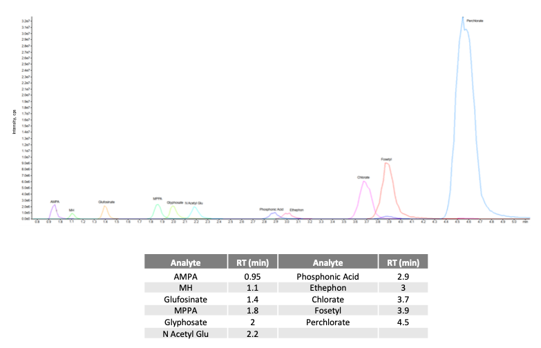 Glyphosate, AMPA, Glufosinate, Chlorate, Perchlorate 등 11종 극성 음이온 농약을 6분 내 LC-MS/MS 분석