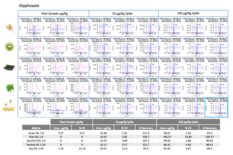 Grain, Kiwi, Zucchini, Rocket, Soy 실제 시료에서 QuPPe-PO 전처리 후 10·100 µg/kg spike 회수율 검증 완료