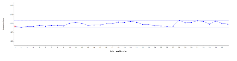 반복 주입에 걸친 Glyphosate 머무름 시간 안정성. Luna Polar Pesticides 컬럼이 극성 분석물에 대해 일관되고 견고한 머무름을 제공함을 입증합니다.