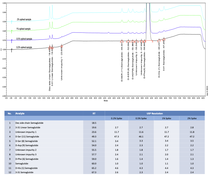 8종 known impurity + 3종 unknown impurity 모두 Semaglutide로부터 분리, Resolution ≥ 1.3