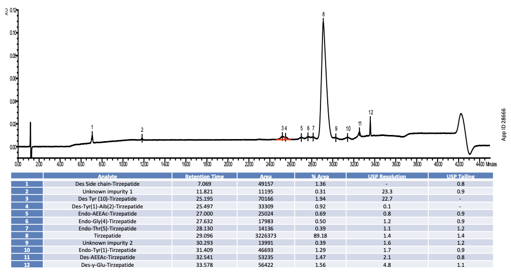 9종 known impurity와 2종 unknown impurity를 모두 Tirzepatide로부터 분리, USP Resolution ≥ 1.0