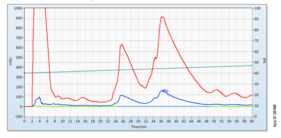 | Gradient | 0 min → 40%B, 50 min → 47%B | 0 min → 40%B, 30 min → 55%B |