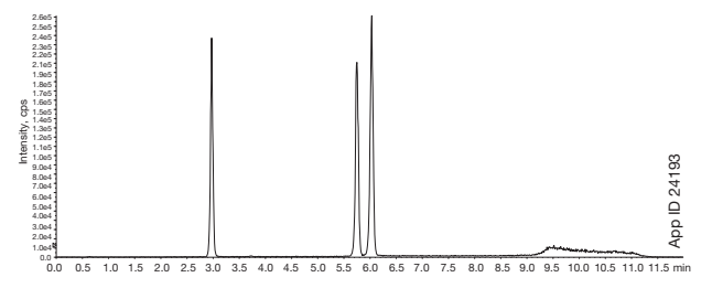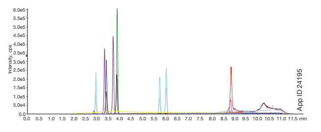 Kinetex 2.6µm Polar C18 컬럼을 사용하여 인간 혈청에서 추출한 8종의 비공액 담즙산을 분석한 크로마토그램입니다. Impact PPT Plate를 활용하여 복잡한 매트릭스 환경에서도 우수한 회수율을 보입니다.